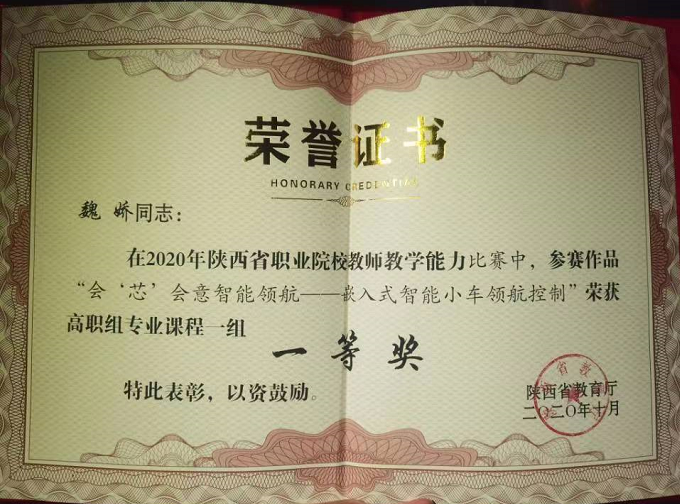 魏娇同志在2020年陕西省职业院校教师教学能力比赛中荣获高职组专业课程一等奖