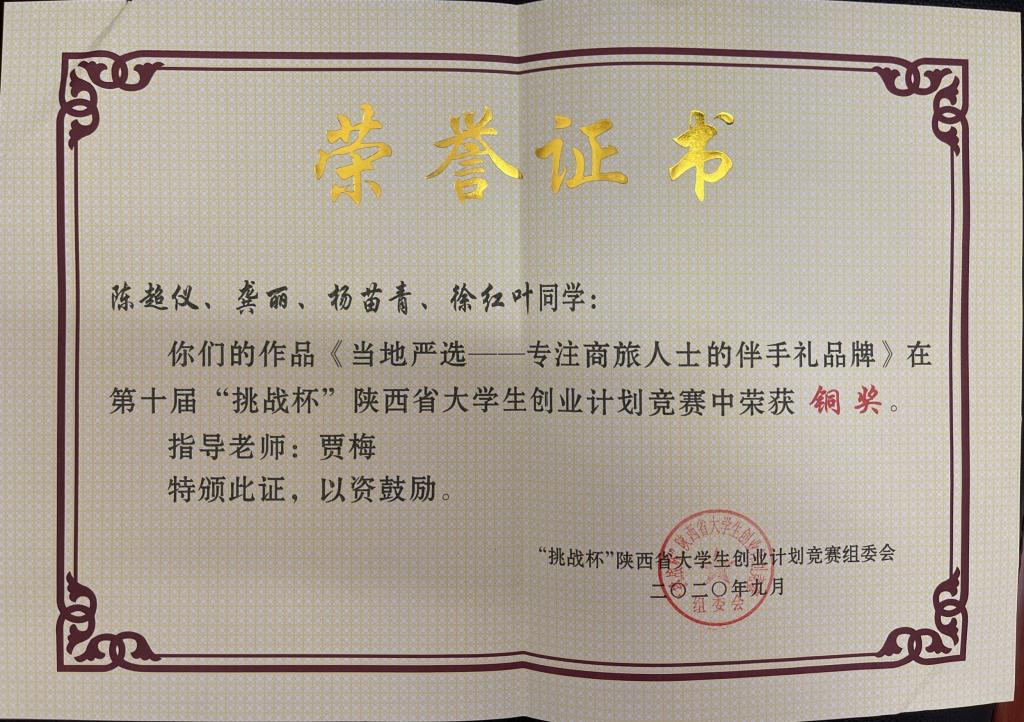 2020年在第十届“挑战杯”陕西省老员工创业计划竞赛中荣获铜奖