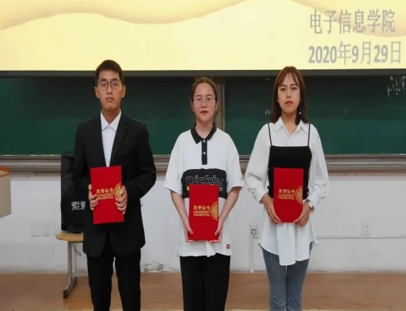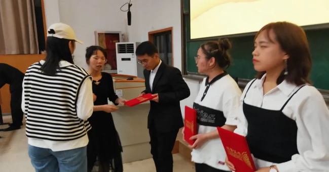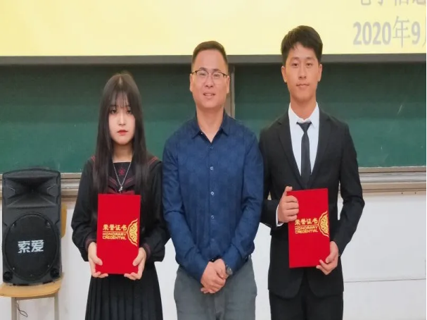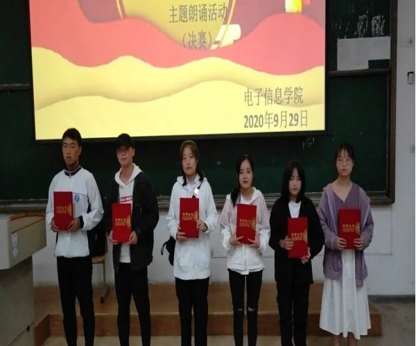 获得三等奖的是:臧文辉同学朗诵《时忆难》;李同姝同学朗诵《祖国颂》;张乐乐、文静同学朗诵《我爱你,祖国》由辅导员董娜老师为获奖同学颁奖。