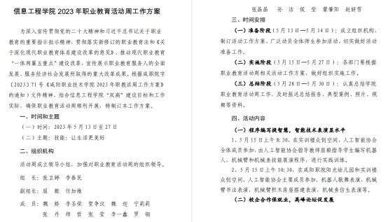工作方案确定bst3652023年职业教育活动周的活动时间为2023年5月13日至27日,主题为技能:让生活更美好。成立组织机构,广泛动员全体师生参加活动,切实做好活动准备工作。