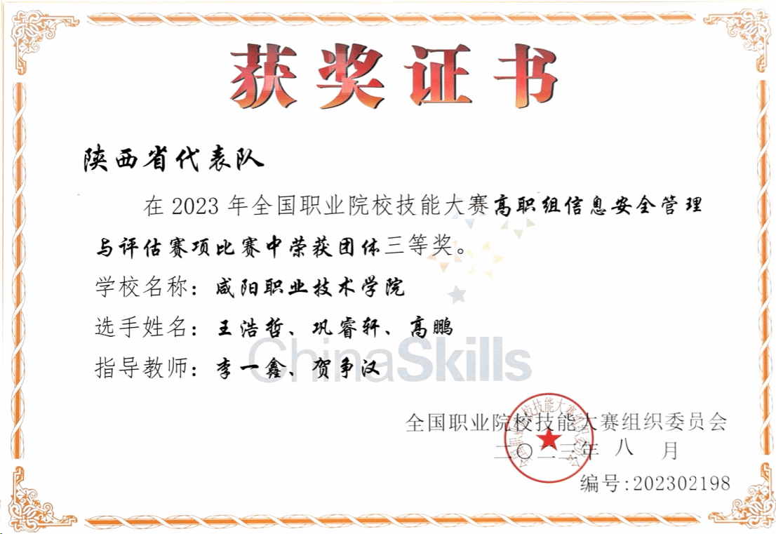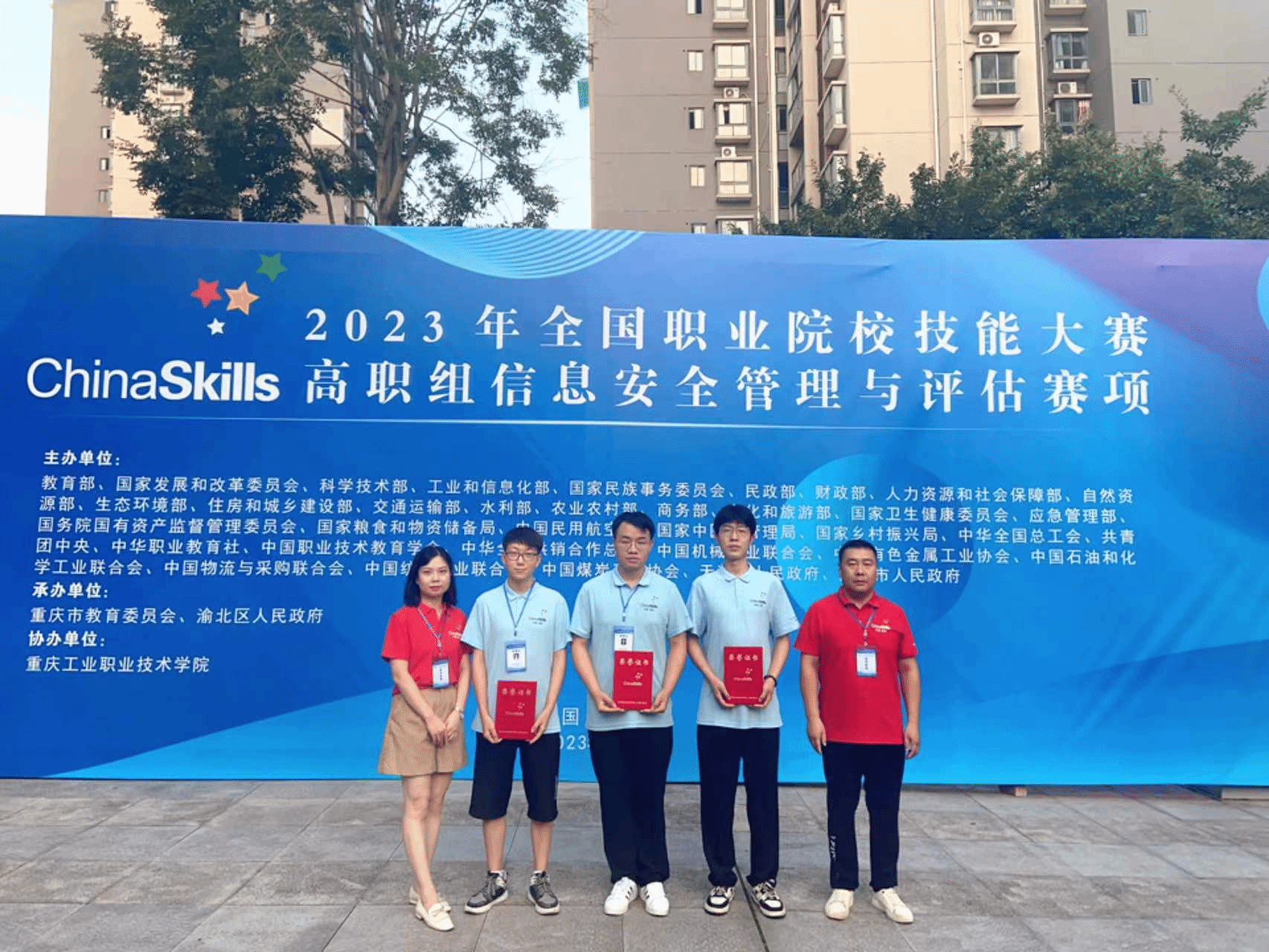 8月20-21日,2023年全国职业院校技能大赛高职组“信息安全管理与评估”赛项在重庆工业职业技术公司成功举办。来自全国各省市自治区的62支参赛队伍同台竞技,经过两天的激烈角逐,bst365教师李一鑫、贺争汉指导的三名员工王浩哲、巩睿轩、高鹏获得国赛三等奖的优异成绩。