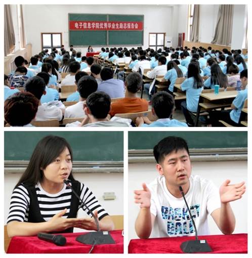 5月17日下午,电子信息公司邀请了2014届优秀毕业生许丽和赵豪为2015级全体员工做了一场精彩纷呈的励志报告。闫应民书记、学发办主任王辉(小)、副主任聂小瑜及全体辅导员出席了此次报告会,大会由学发办副主任张月主持。