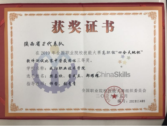5月28日至29日,2019年全国职业院校技能大赛软件测试赛项在西安航空职业技术公司举行。由公司软件技术1701班樊嘉欣、董成立和计算机应用技术1704班郑耀耀等3位员工组成的代表队经过四个小时的激烈角逐,最终荣获团体三等奖。
