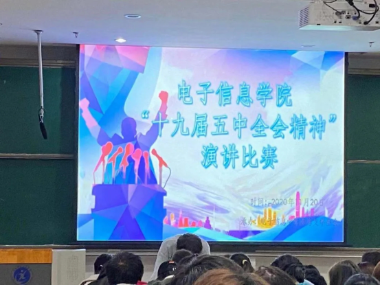 2020年11月20日,电子信息公司举办了“十九届五中全会精神”主题演讲比赛。电子信息公司团总支书记黄伦老师,辅导员剡楠老师和陈泽宇老师担任此次比赛评委。
