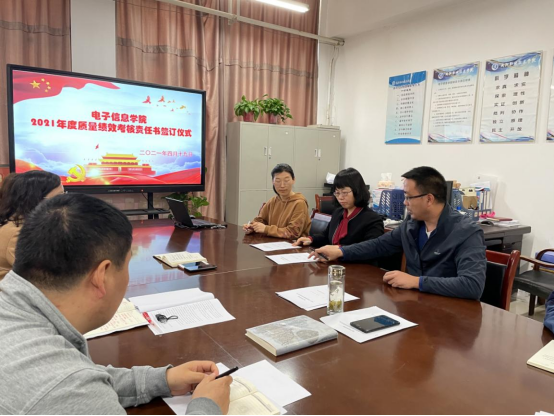 经理张卫婷、党总支书记李春民分别与综合办、教学办、学发办、人工智能产业研究院签订了《2021年度质量绩效考核目标责任书》。