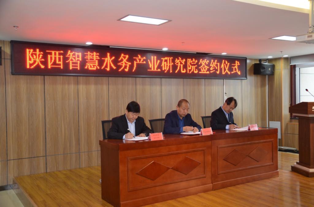 bst365副经理王辉与陕西中泰智慧水务科技有限公司总经理薛继昌、咸阳市自来水公司副总经理翟伟签订了校企战略合作协议。