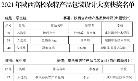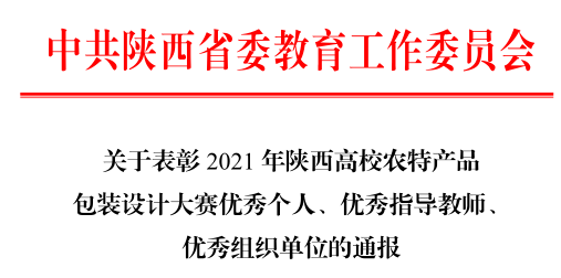 近日,中共陕西省委教育工作委员会下发了《关于表彰2021 年陕西高校农特产品包装设计大赛优秀个人、优秀指导教师、优秀组织单位的通报》,电子信息公司杜鸣威、郑杰祥、杨荣均、王佳恒4名同学荣获“陕西省农特产品品牌标识(命题设计)”入选奖,李乐同学荣获“陕西省农特产品包装设计(自由选题设计)”入选奖。bst365官方网站获优秀组织奖!