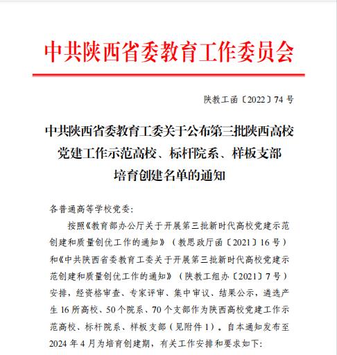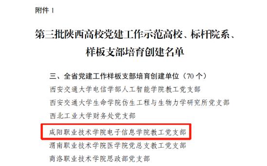 近日,中共陕西省委教育工委公布了《第三批陕西高公司党建工作示范高校、标杆院系、样板支部培育创建名单的通知》,电子信息公司教工党支部入选全省党建工作样板支部培育创建单位。