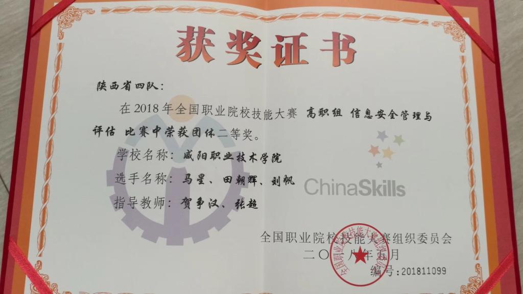 2018年全国职业院校技能大赛高职组信息安全与评估比赛中荣获团体二等奖